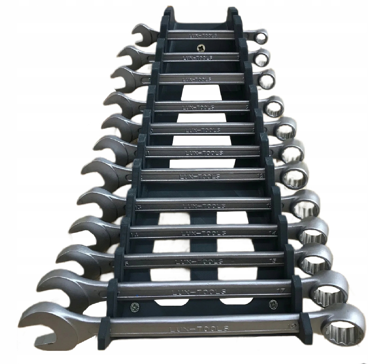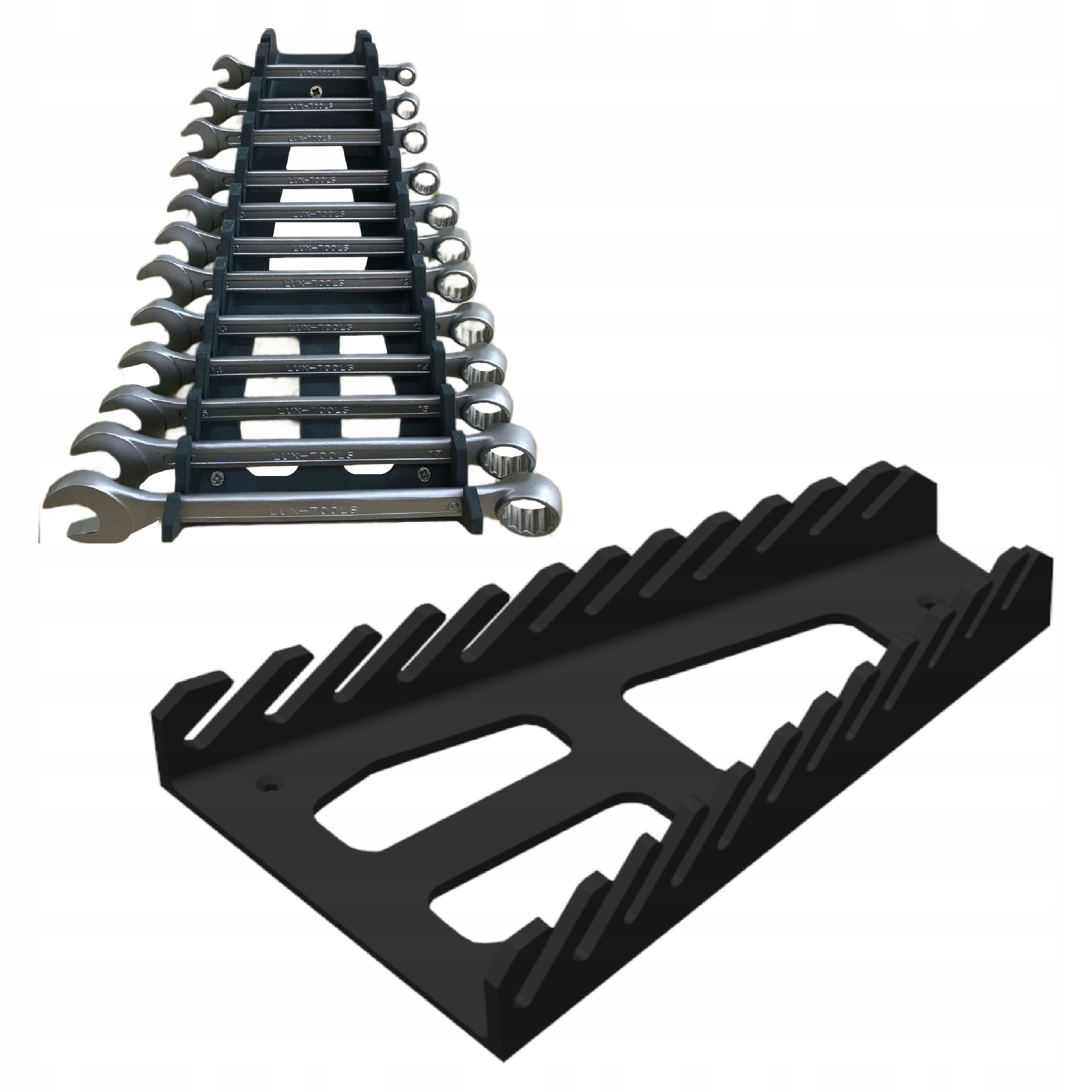 Oferuję uchwyt/stojak na klucze płaskie, idealny do przechowywania i organizacji narzędzi w warsztacie lub garażu. Dzięki przemyślanej konstrukcji umożliwia bezpieczne i wygodne przechowywanie 12 kluczy płaskich, zapewniając szybki dostęp do każdego narzędzia.